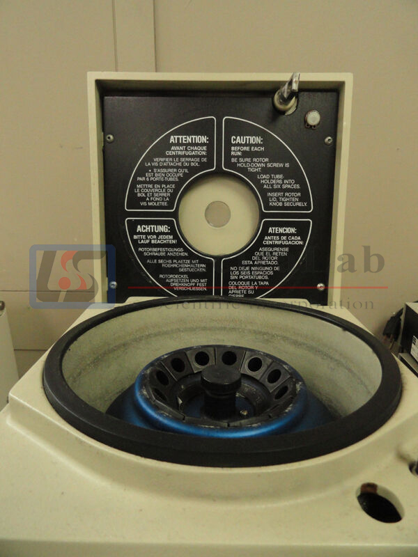 This Non-refrigerated tabletop microcentrifuge with a maximum speed of 12,500 rpm and a 15-minute timer is in working condition.