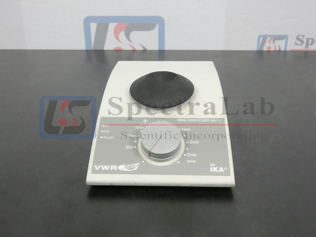 The VWR IKA Model MV1 Mini Vortexer is in excellent condition. The MV1 operates on a 4.5mm orbit and has a speed range of 200 to 2500 rpm for all of your mixing needs.